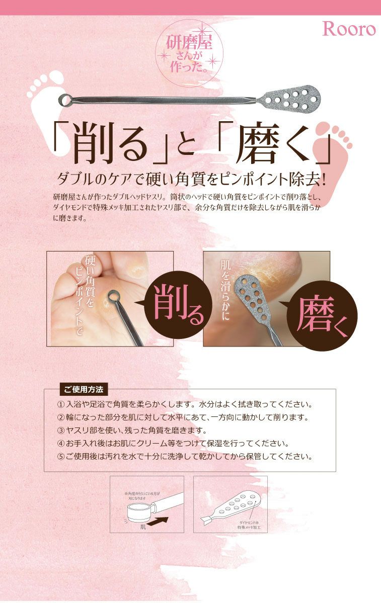 他の画像を見る ローロ ピンポイント角質やすり RO-PY (メール便でも可) 販売価格 ¥ 1,408 税込 販売期間 2025/07/07 10:00 〜 巻き爪でも削れる!研磨屋さんが作った2WAYダイヤモンドヤスリ カートに入れる お気に入りに登録する